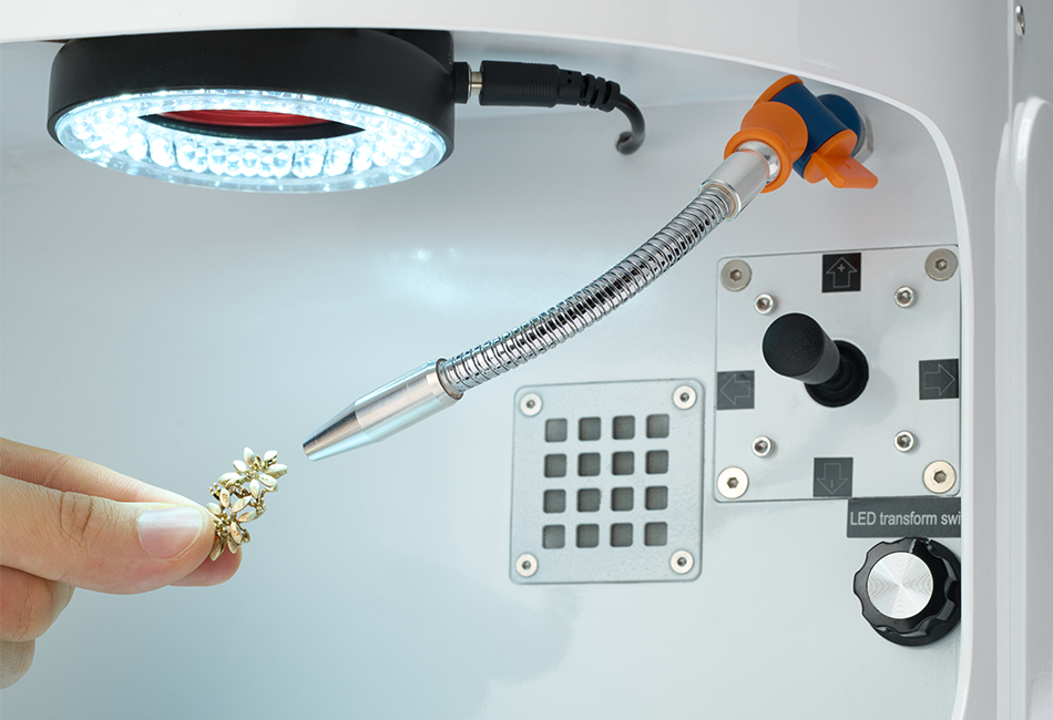 Materials such as silver, copper and fine gold, which require a high melting energy, can be processed quickly and optimally with the welding laser. The robust casing and extra-large working chamber with a removable base are impressive features. This makes it the obvious choice for multi-shift operation and larger series production.
